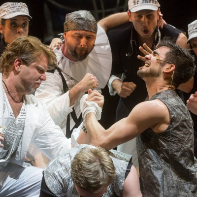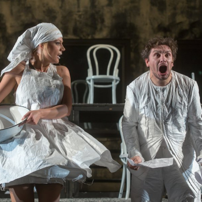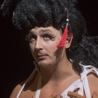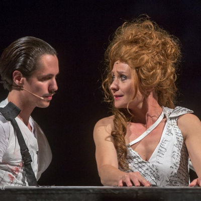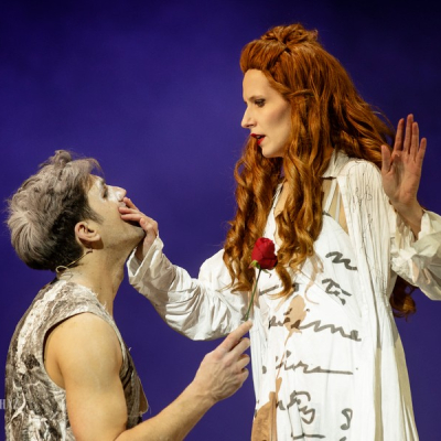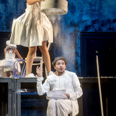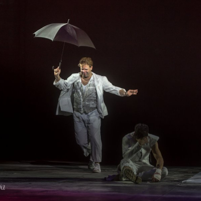 “Cyrano does not have a big nose in this production, on the one hand, because the nose is the symbol of our complexes and frustrations, and on the other, because today a Cyrano with a big nose would be considered old-fashioned. To judge Cyrano solely on the basis of his big nose would reinforce the comic situation, but this effect can also be reached without a big nose. Furthermore, it turns out that the unusual size of his nose is only alleged by Cyrano, and others merely react to his claim. This is the basis of my idea, according to which Cyrano only imagines his nose to be big,” says Georgian director David Doiashvili.