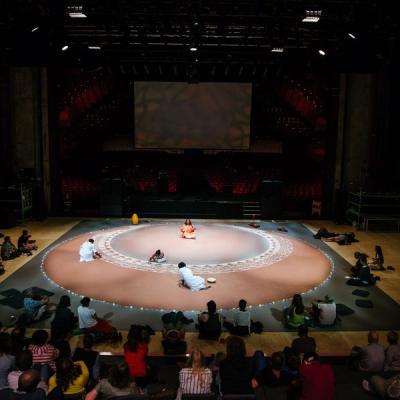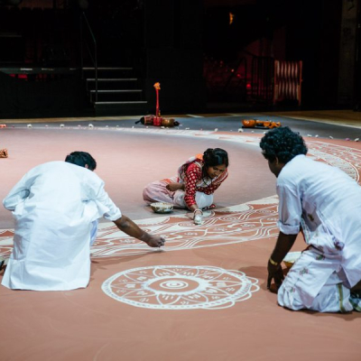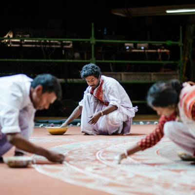 The Álpaná refers to colourful motifs, sacred art or painting done with hands and paint which is mainly a paste of rice and flour on auspicious occasions in Bengal. The word Alpana is derived from the Sanskrit alimpana, which means 'to plaster' or 'to coat with'. Traditionally, it was drawn by the women of the house before sunset. In the performance a several meters wide Álpaná will be drawn on the floor by three Álpaná artists over the span of two hours, and the audience will be invited in the conclusion to offer their own motifs in the center.